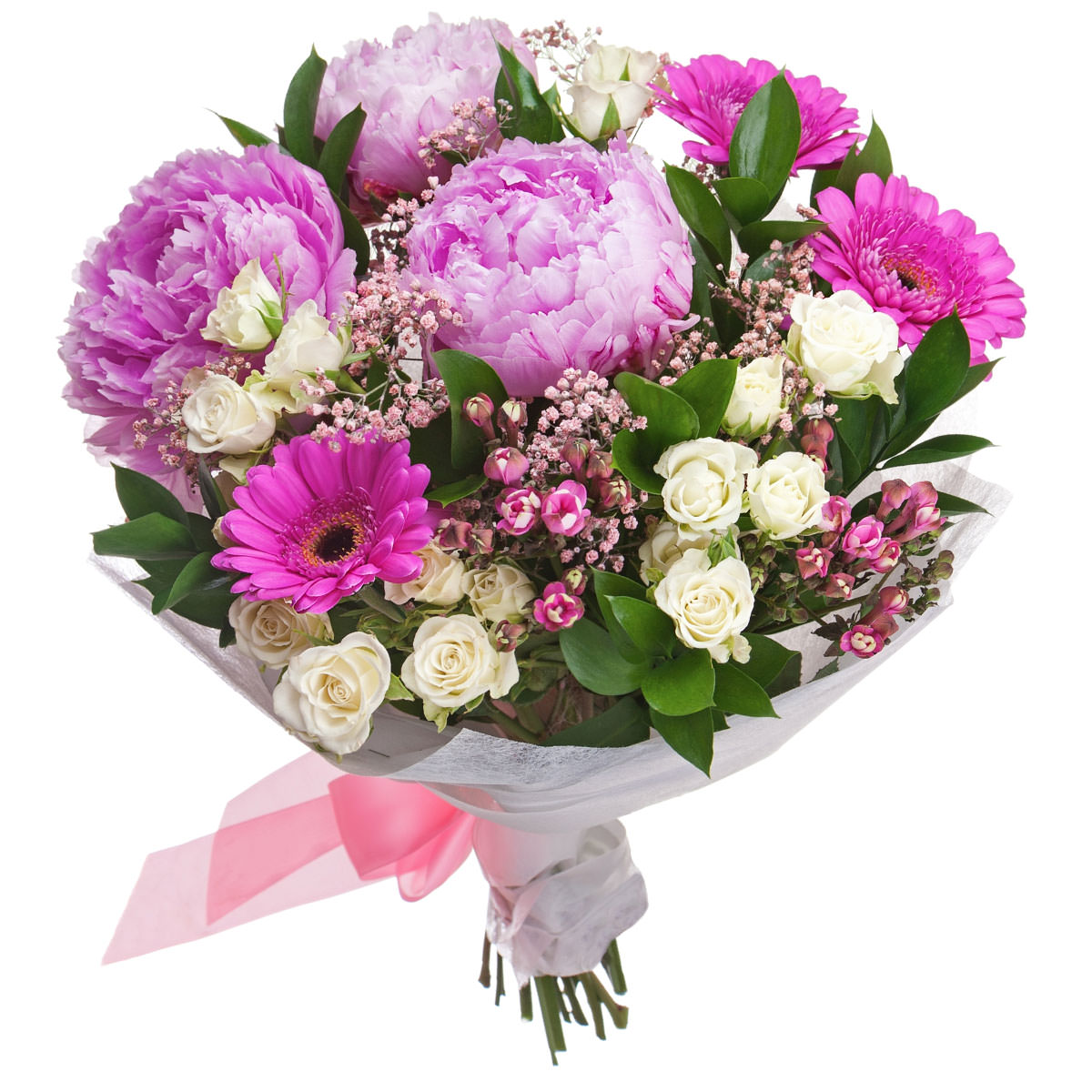 Пион розовый, гербера розовая, роза кустовая белая, ваксфлауэр, гипсофила. Упаковка (лента, пленка, крафт, сетка, пленка матовая)
