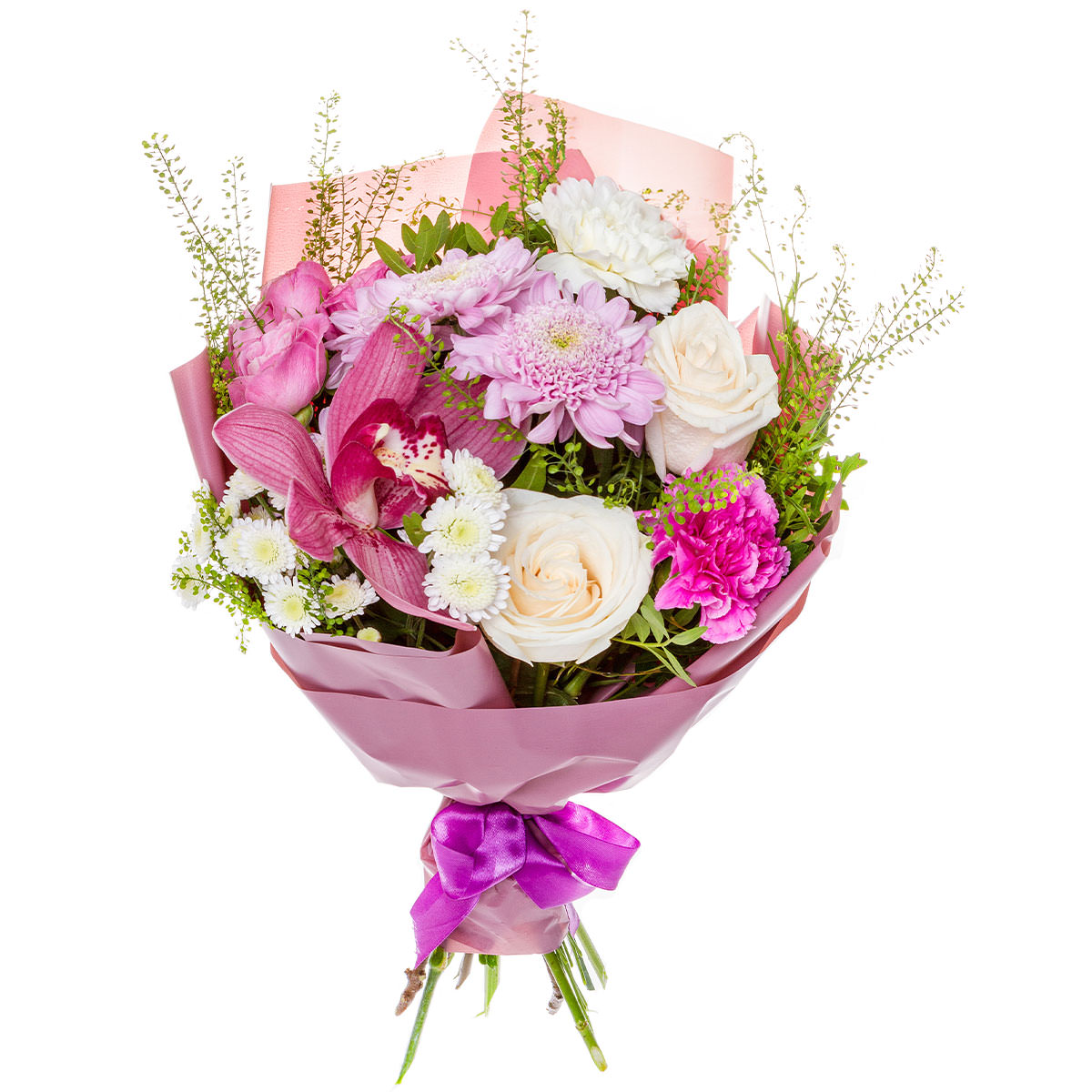 Орхидея розовая, хризантема кустовая белая и сиреневая, роза кустовая розовая, роза одноголовая белая, вереск. Упаковка (лента, пленка, крафт, сетка, пленка матовая)
