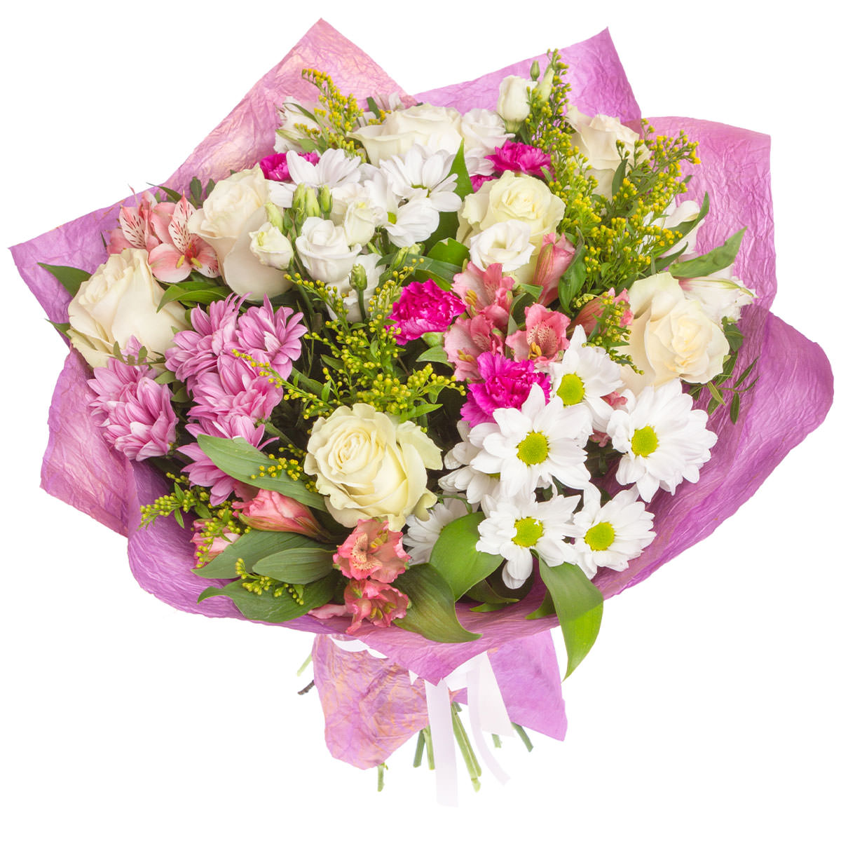 Хризантема кустовая розовая и белая, роза одноголовая белая, альстромерия розовая, солидаго. Упаковка (лента, пленка, крафт, сетка, пленка матовая)