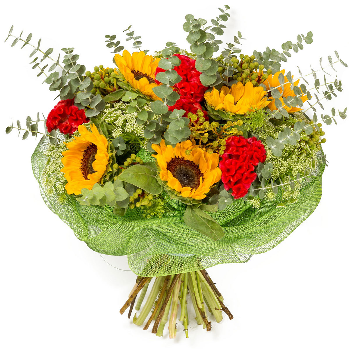 Подсолнух, целозия красная, очиток, эвкалипт. Упаковка (лента, пленка, крафт, сетка, пленка матовая)