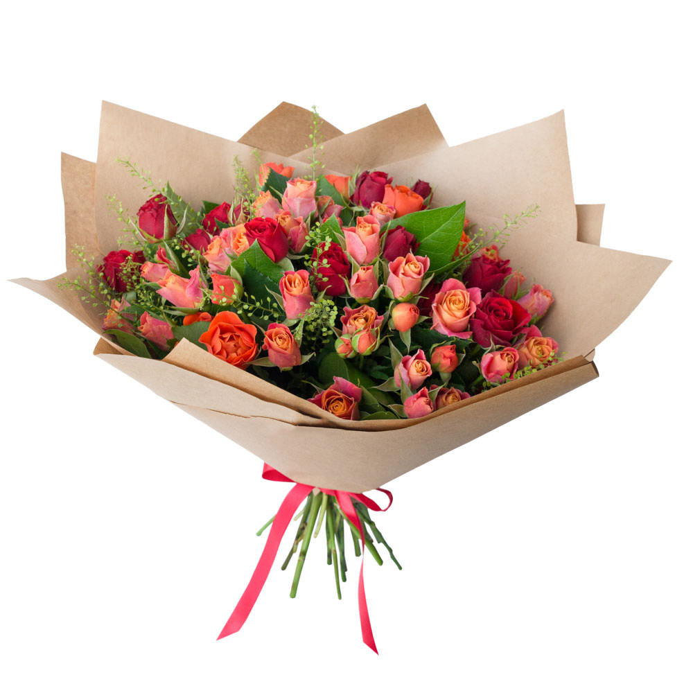 Роза кения микс (розовая, бордо, оранжевая), тласпи, салал. Упаковка (лента, пленка, крафт, сетка, пленка матовая)