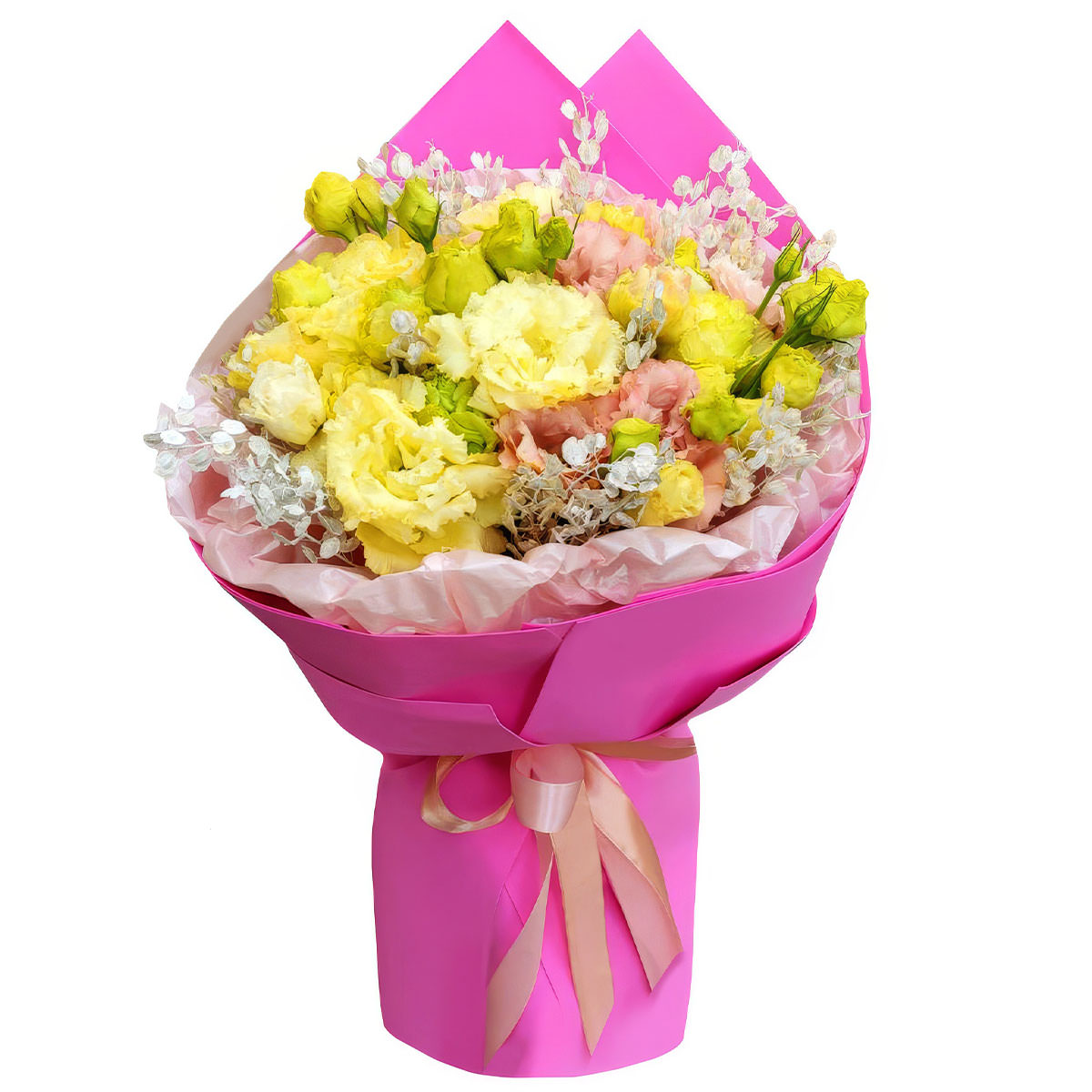 Эустома желтая и розовая, лунария. Упаковка (лента, пленка, крафт, сетка, пленка матовая)