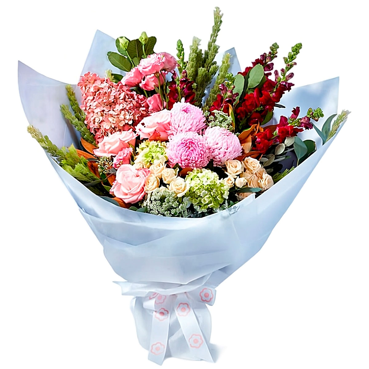 | Состав | Гортензии, Ирисы, Кустовые розы, Маттиола, Розы, Хризантемы |