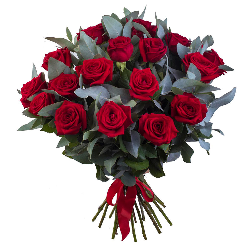 Роза одноголовая бордовая, эвкалипт. Упаковка (лента, пленка, крафт, сетка, пленка матовая)