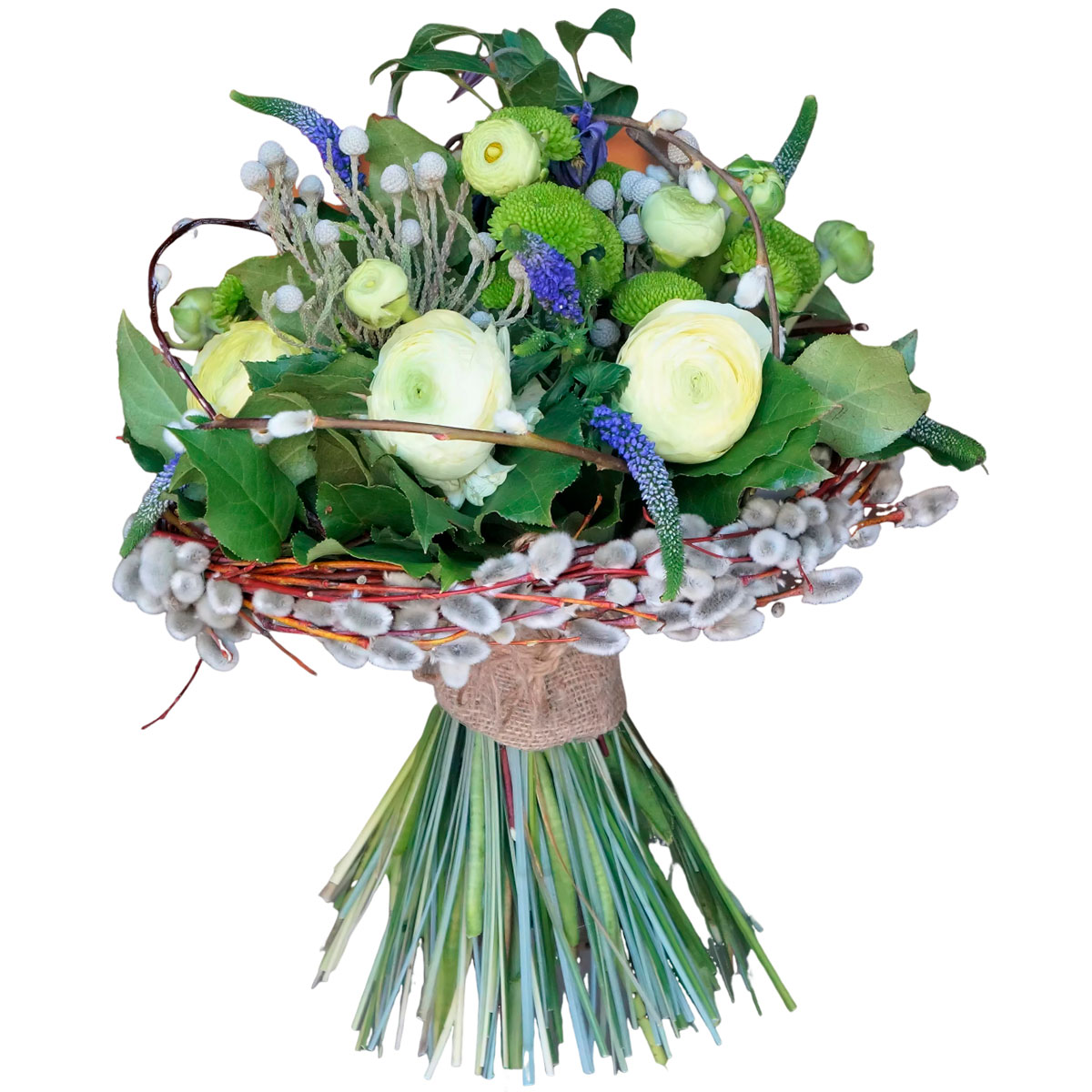Роза пионовидная белая, хризантема кустовая зеленая, вероника, бруния, зелень. В каркасе (верба)