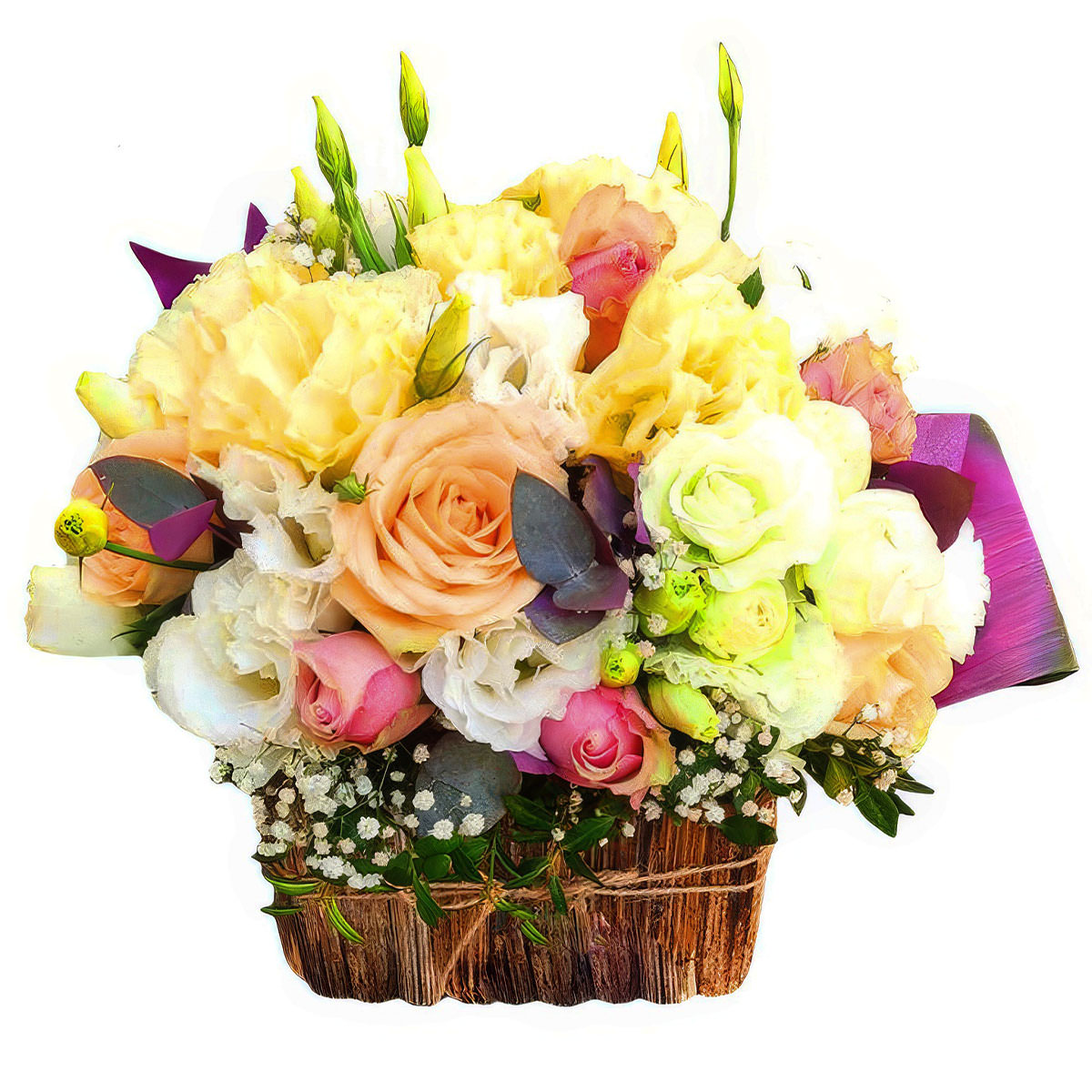 Роза одноголовая персиковая и розовая, эустома белая, гвоздика желтая, гипсофила, эвкалипт. Упаковка (Корзина, оазис, ящик).