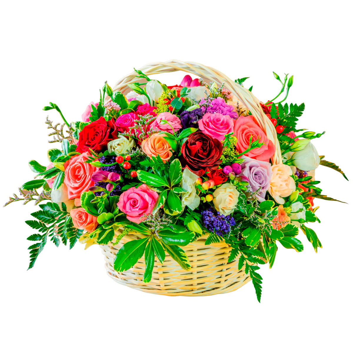 Роза одноголовая разных цветов, роза кустовая разных цветов, гиперикум, гвоздика сиреневая, эустома белая, зелень. Упаковка (Корзина, оазис, ящик).