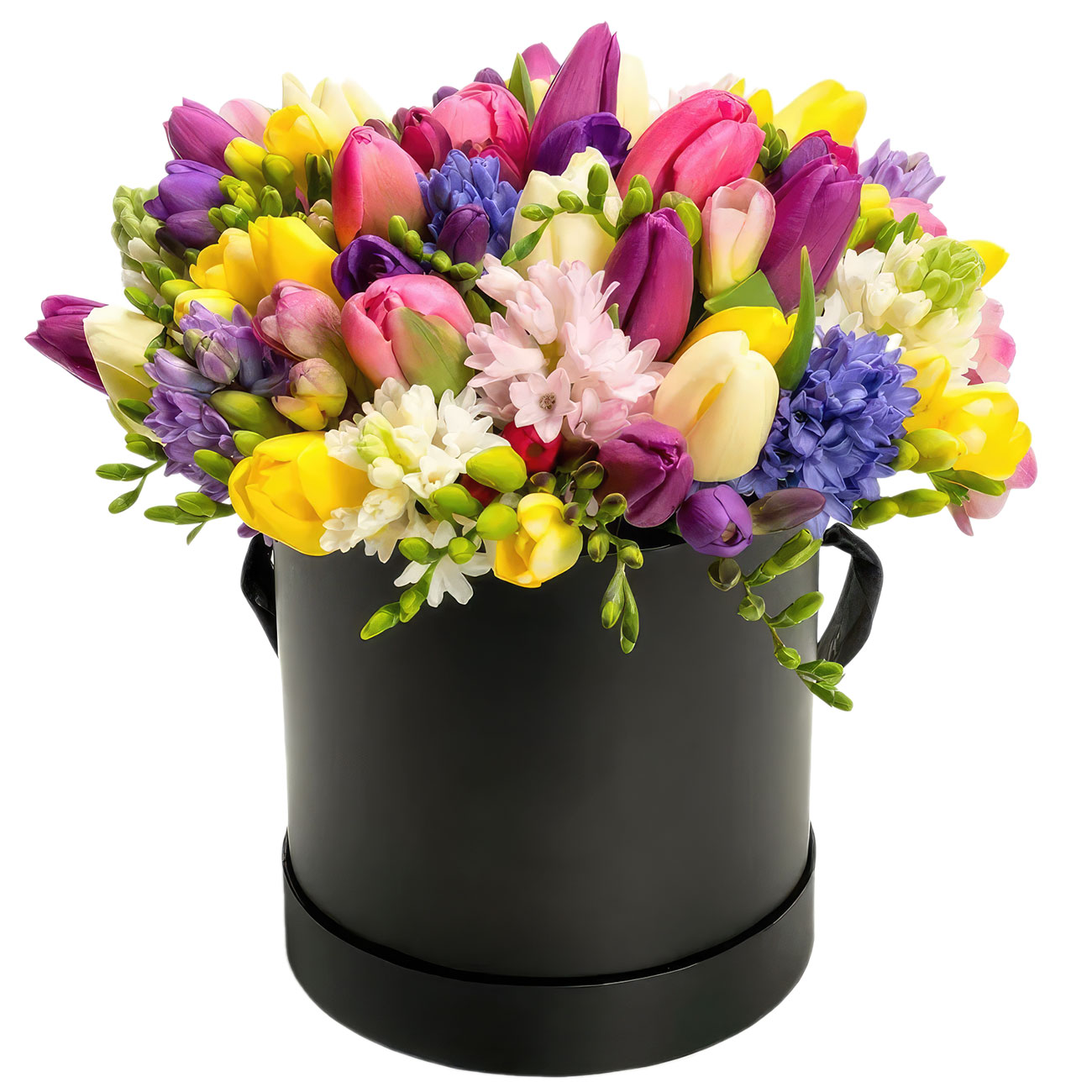 Тюльпан микс (желтый, розовый, сиреневый), гиацинт микс, фрезия желтая. Упаковка (шляпная коробка, квадратный бокс, коробка сердце, оазис)